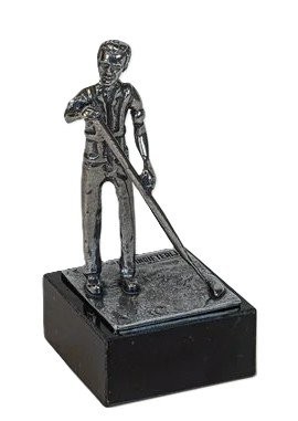 Tinnen sculptuur van de Hovenier, compleet met werkoutfit en schoffel, een perfect cadeau voor hoveniers, groenvoorzieners, tuinliefhebbers of medewerkers in de groensector.